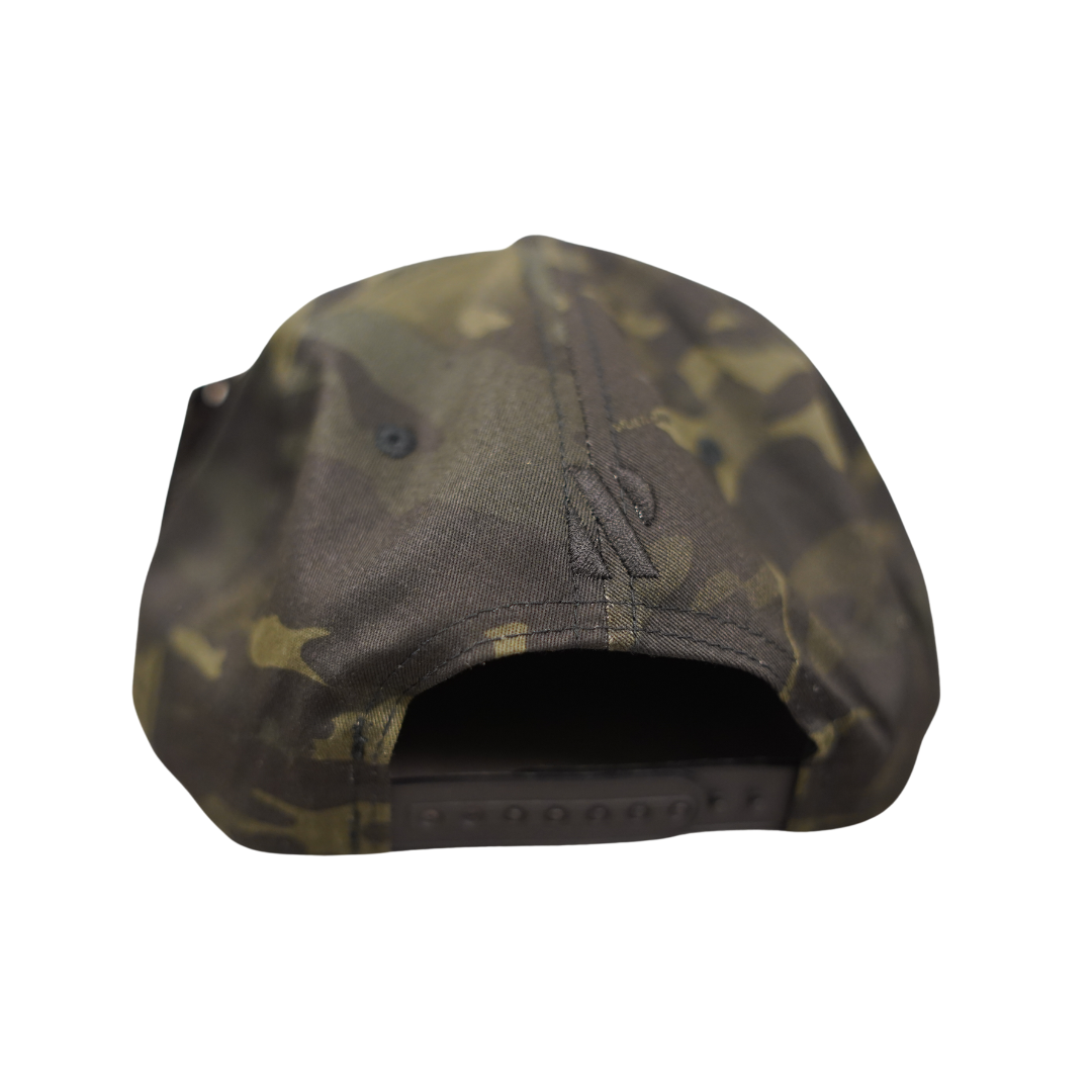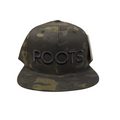 Classic Yupoong Snapback Hat with ROOTS puffy embroidered in black. Available in black and camo.